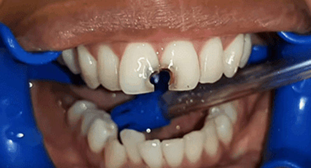 Area gigi yang berlubang atau patah dibersihkan dari jaringan yang rusak tanpa merusak jaringan sehat. - Aplikasi Resin Komposit